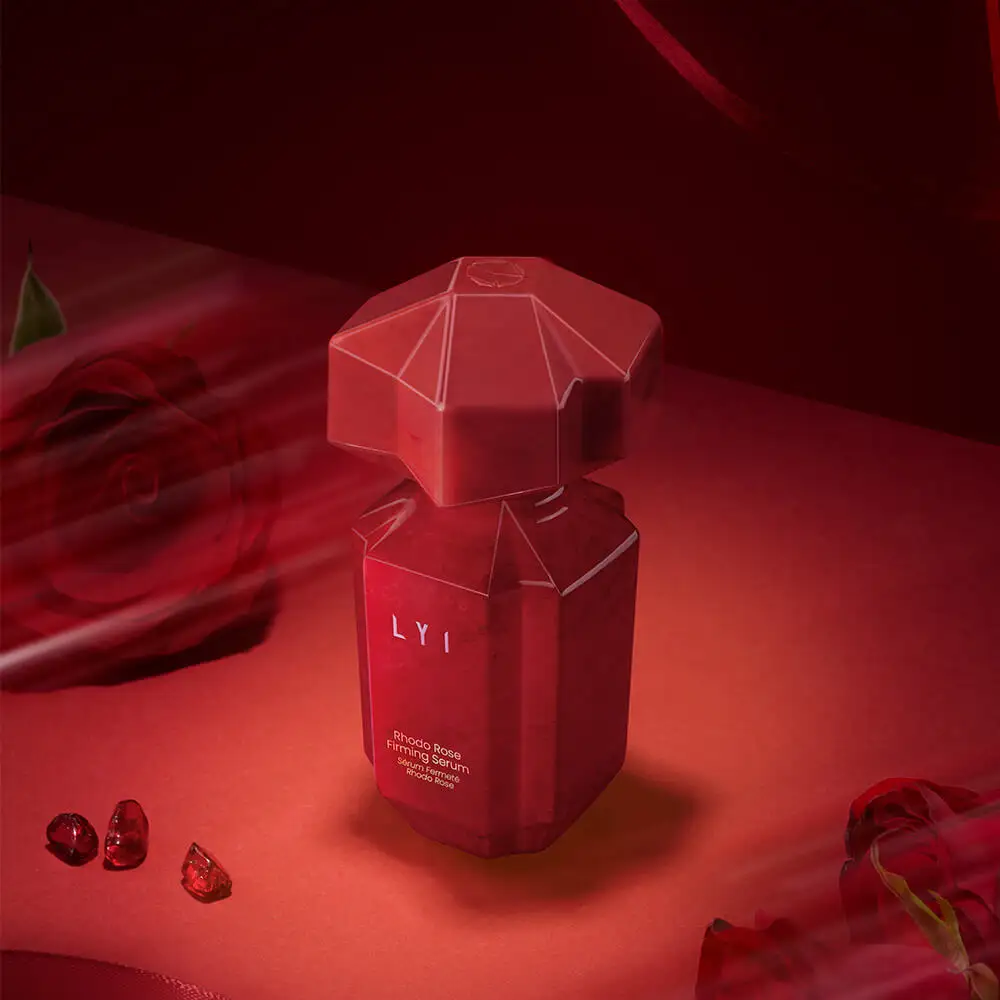 Experience transformative lifting with LYI Rhodo Rose Firming Serum, featuring rare rhodochrosite gemstone extract and patented MMC75™ exosomes for deep hydration, wrinkle smoothing, and V-shaped contour definition in anti-aging skincare.